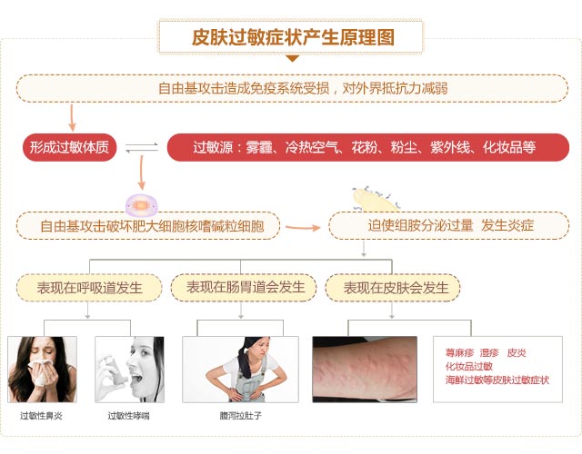 生活中很多过敏原不可避免,其中部分是人们必须要接触的,如:冷空气、紫外线、花粉、粉尘、化 妆品、海鲜、酒精及辛辣食物等,这些正常人都可以随意接触的物质,却成为过敏人群的健康杀手。
